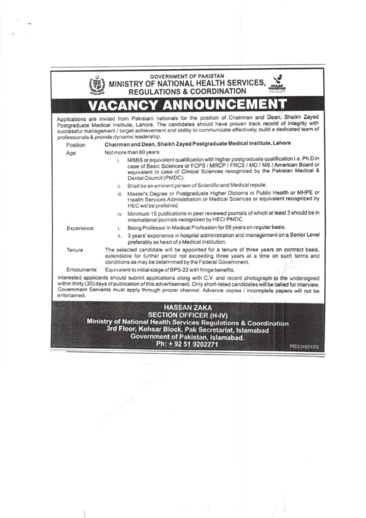 Vacancy announcement of Chairman and Dean Shaikh Zayed Postgraduate Medical Institute Lahore January 21, 2026